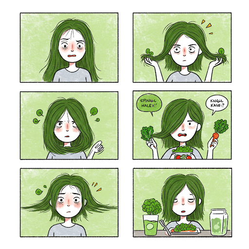 오늘부터 녹색 잎채소를 충분히 섭취하여 아름답고 건강한 머릿결을 유지해 보세요! 😊